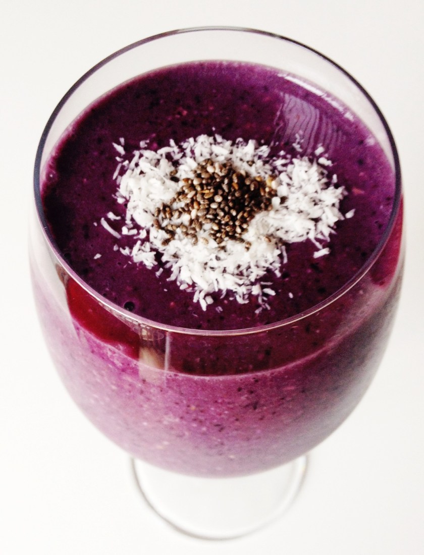 A delicious start to the day! Ingredients: 1/4 cup Rolled oats 1/2 cup Blueberries 1 Banana 1/4 cup Almond milk 3/4 cup Water 3 ice cubes 1 tsp Maca root Dash of Nutmeg Directions: Blend together and garnish with unsweetened shredded coconut and 1 tsp Chia seeds Did you know? If you’re trying to quite smoking, banana’s contain high levels of vitamin B, potassium and magnesium to counteract withdrawal effects! HEALH BENEFITS Banana Protect against muscle cramps during workouts and nighttime leg cramps Reduce swelling, protect against type II diabetes, aid weight loss, strengthen the nervous system, and help with the production of white blood cells due to vitamin B Blueberries Number 1 in antioxidant activity when compared to 60 other fresh fruits Neutralizes free radicals within the body and aids in belly fat reduction Chia Seeds Highest Omega-3 source content in nature – higher than salmon Balances and stabilizes blood sugar level by slowing down the level at which glucose enters your bloodstream Maca Root (superfood) Works as an adaptogen which means that it responds to …